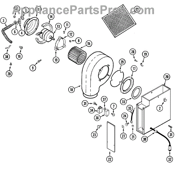 This blower wheel mounts on the drive motor and pushes air through the dryer drum and out the exhaust. Replacing a worn wheel restores proper airflow for consistent drying and helps prevent overheating and nuisance shutdowns. What it does:
