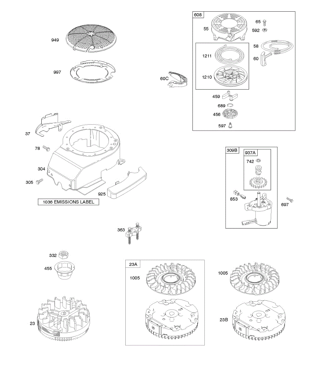 A rewind starter, also called a recoil starter, is an assembly on many types of lawn and garden equipment used to trigger combustion in the engine. Set at the front or top of the engine, it cues the starting mechanism to turn the engine fast enough for a spark to ignite fuel in the cylinder when the handle is pulled. This part features a recoil spring connected to a pulley, and when the rope is yanked, it stretches a recoil spring. Letting go of the rope causes the spring to snap back, and the user will be able to continually pull the rope and get things moving faster and faster until there is combustion. The rope is part of the pulley system that will pull out and recoil quickly into the starter cover on top of the engine when the user pulls the starter rope’s handle. If there is no recoil or the rope gets stuck, it may need to be replaced. Without a functional starter assembly, the machine won’t work. A rewind starter kit can be used to address this issue. An authentic OEM part, it works with Briggs & Stratton and Husqvarna equipment. It contains a plastic shroud, starter pulley, starter spring, grip, the pull rope, and all hardware necessary to attach it to the machine.