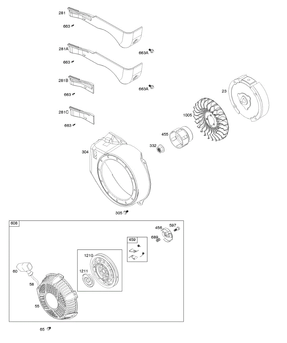 Parts for Briggs & Stratton 083132-1199-H1: Blower Housing, Flywheel, Rewind Starter Parts