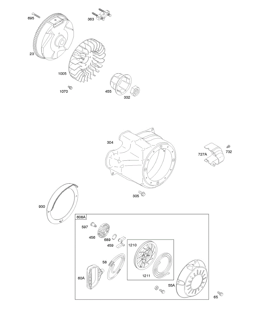 Parts for Briggs & Stratton 20M114-1358-E2: Blower Housing / Shrouds, Flywheel, Rewind Starter Parts