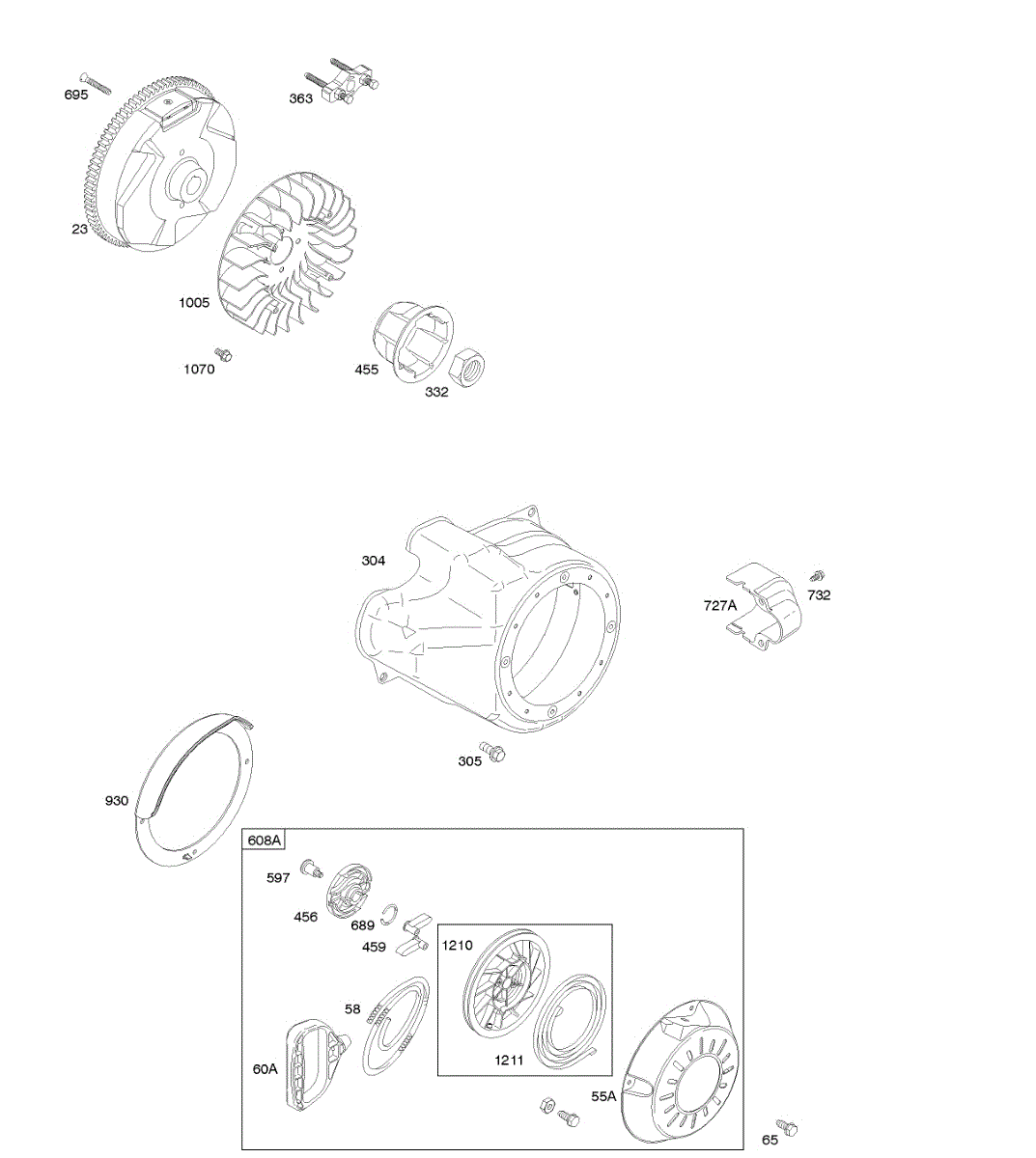 Parts for Briggs & Stratton 21M114-0370-E2: Blower Housing / Shrouds, Flywheel, Rewind Starter Parts