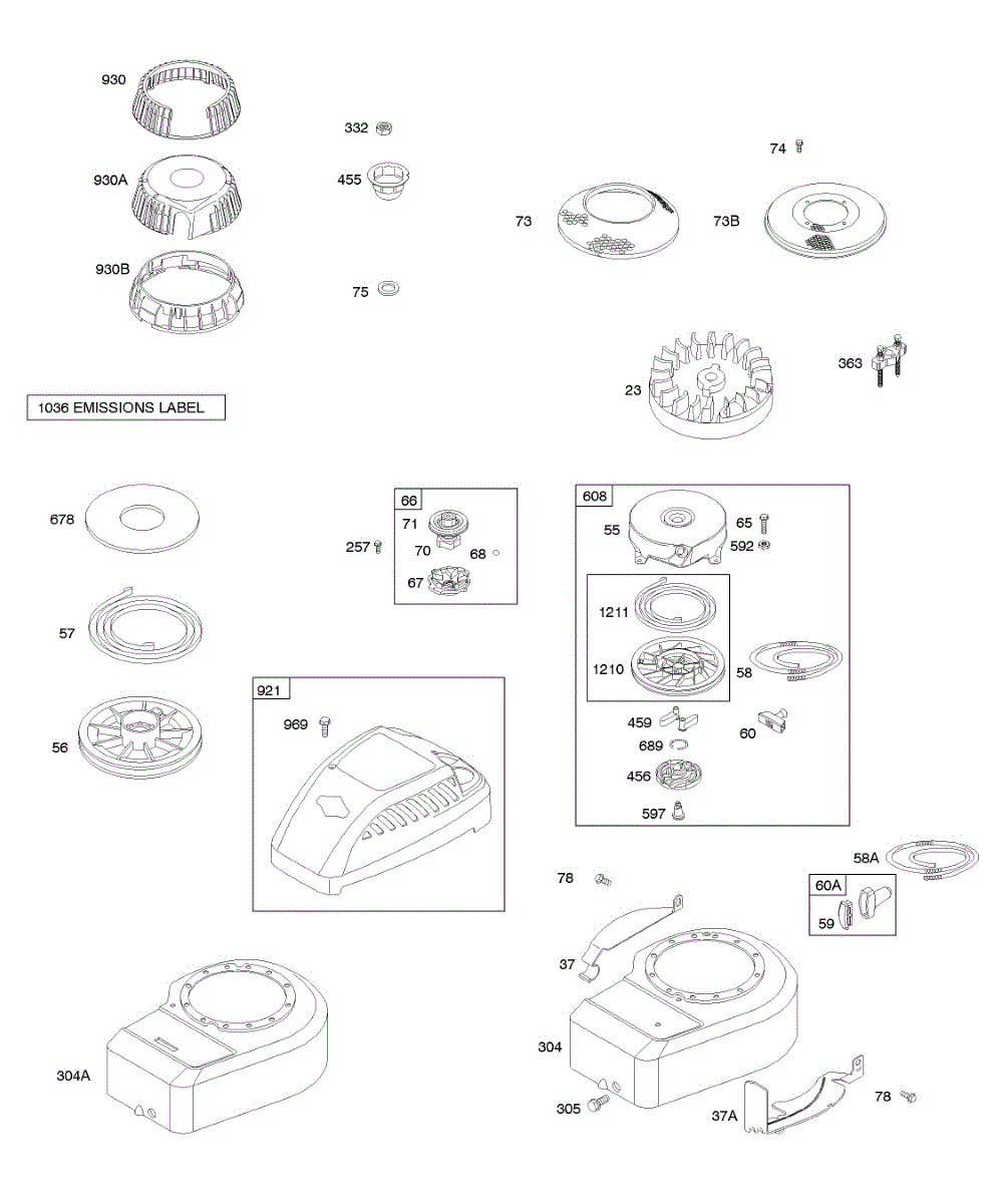 Parts for Briggs & Stratton 098902-2228-B2: Blower Housing / Shrouds, Flywheel, Rewind Starter Parts
