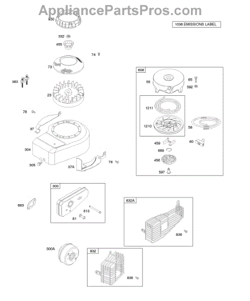 Parts for Briggs & Stratton 09J902-0368-E1: Blower Housing / Shrouds, Exhaust System, Flywheel, Rewind Starter Parts