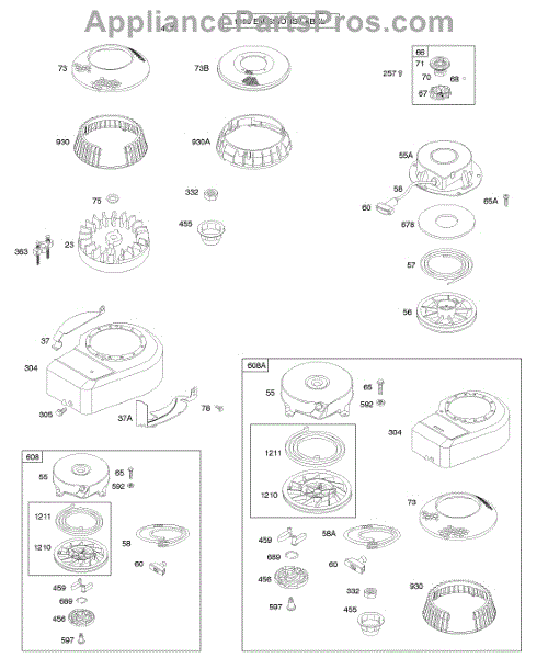 The starter pulley, also known as the recoil pulley, is a standard part that is found on a number of pull-start engines from Briggs & Stratton. This pulley is attached to the starter spring and the flywheel. When the starter rope is pulled, it engages the starter spring, which causes the pulley to react and turn the flywheel, engaging the engine. This pulley and the entire starter system are exposed to constant repetitive motion, which can cause parts to become worn or damaged. This pulley may fail to function or become damaged, which will require a full replacement. This genuine OEM starter recoil pulley is made of durable plastic and produced to exact standards. Briggs & Stratton engines that take this starter pulley can be found on several lawn and garden equipment engines. This durable plastic part is sold as an individual unit and does not include the starter rope or other parts of the starter housing. If those are required, they will need to be purchased separately. This pulley may also be available as part of a full starter housing replacement. Always disengage the spark plug when working on the starter system or engine components and wear gloves for hand protection.