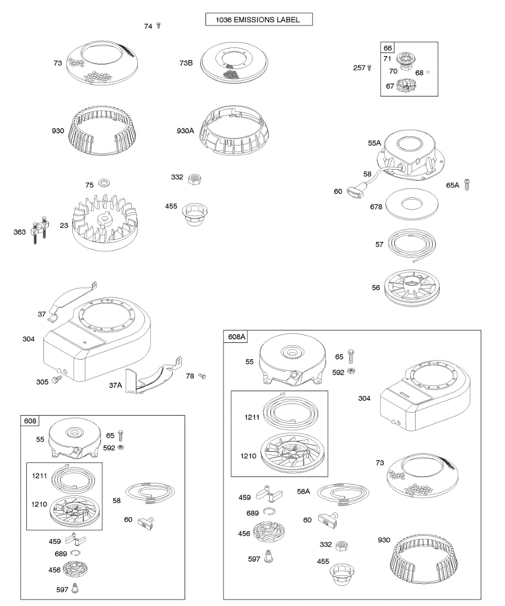 Parts for Briggs & Stratton 10B902-0111-01: Blower Housing / Shrouds, Flywheel, Rewind Starter Parts