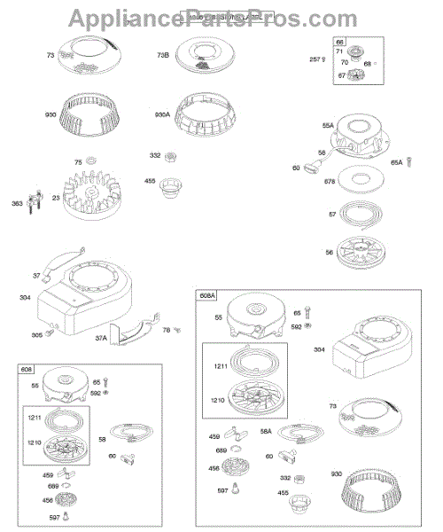 The starter pulley, also known as the recoil pulley, is a standard part that is found on a number of pull-start engines from Briggs & Stratton. This pulley is attached to the starter spring and the flywheel. When the starter rope is pulled, it engages the starter spring, which causes the pulley to react and turn the flywheel, engaging the engine. This pulley and the entire starter system are exposed to constant repetitive motion, which can cause parts to become worn or damaged. This pulley may fail to function or become damaged, which will require a full replacement. This genuine OEM starter recoil pulley is made of durable plastic and produced to exact standards. Briggs & Stratton engines that take this starter pulley can be found on several lawn and garden equipment engines. This durable plastic part is sold as an individual unit and does not include the starter rope or other parts of the starter housing. If those are required, they will need to be purchased separately. This pulley may also be available as part of a full starter housing replacement. Always disengage the spark plug when working on the starter system or engine components and wear gloves for hand protection.