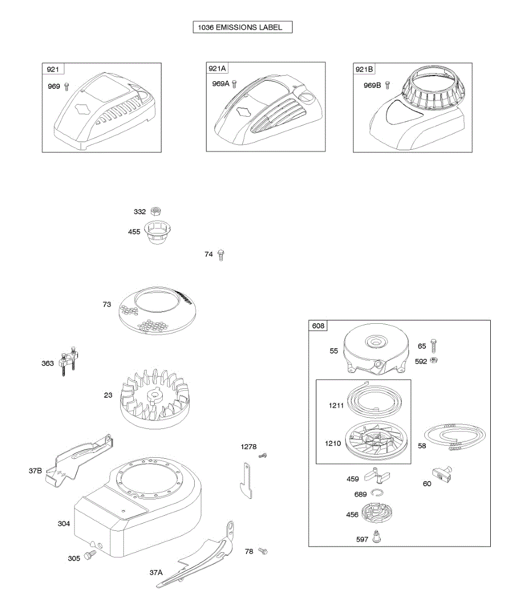 Parts for Briggs & Stratton 10E902-0118-B1: Blower Housing / Shrouds, Flywheel, Rewind Starter Parts
