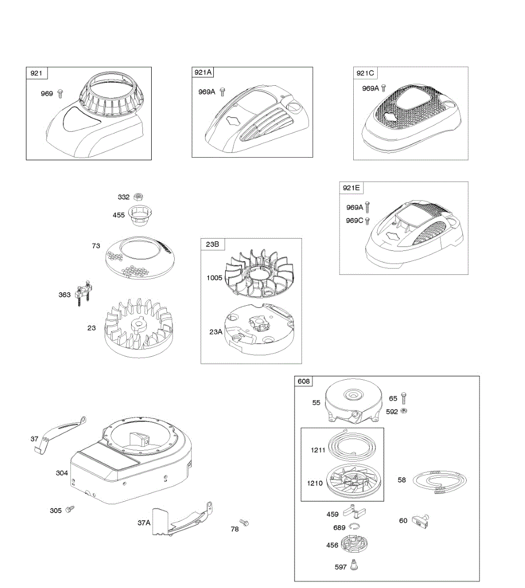 Parts for Briggs & Stratton 10T702-0857-E1: Blower Housing / Shrouds, Flywheel, Rewind Starter Parts