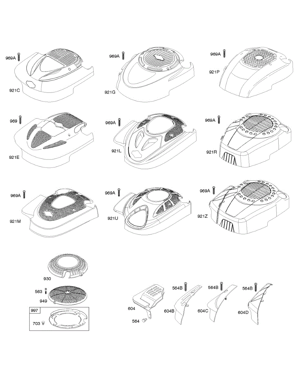 Blower housing cover installs over the engine cooling fan to protect internal components. Replace if cracked, broken, or missing to restore proper airflow.
