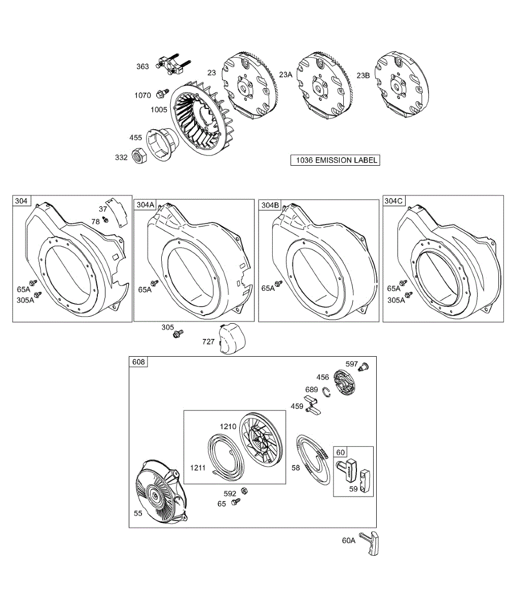 Parts for Briggs & Stratton 126412-0234-E1: Blower Housing / Shrouds, Flywheel, Kits / Gaskets - Carburetor, Rewind Parts