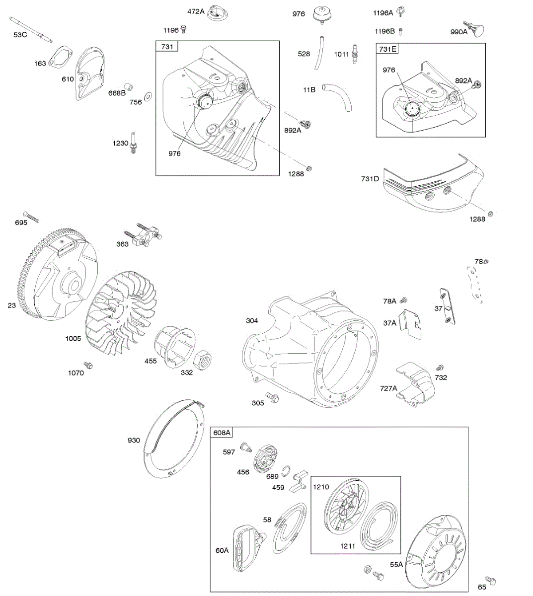 Parts for Briggs & Stratton 20P214-0929-E1: Blower Housing / Shrouds, Flywheel, Rewind Starter Parts