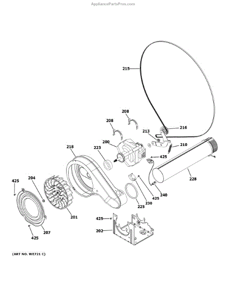 The BLOWER WHEEL is an OEM part for GE electric dryers. It is housed within the blower motor housing and works to push air through the dryer ducting. During cycles, the rotating blower wheel creates crucial airflow that carries heated air through clothes to dry them efficiently.
