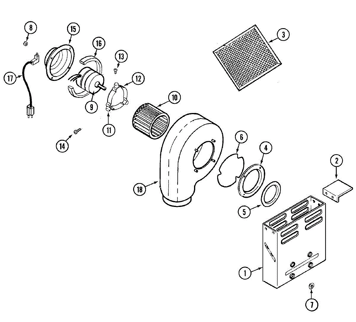 • Moves air across the heater, through the drum, and out the vent to remove moisture