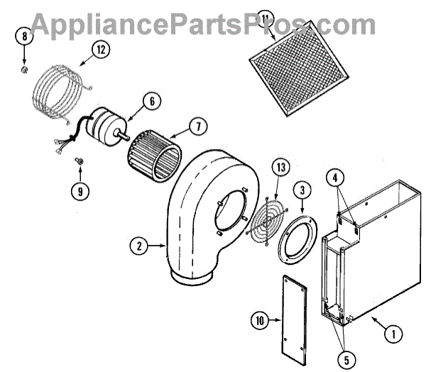 This blower wheel mounts on the drive motor and pushes air through the dryer drum and out the exhaust. Replacing a worn wheel restores proper airflow for consistent drying and helps prevent overheating and nuisance shutdowns. What it does: