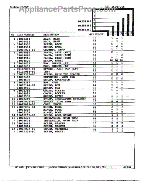 This factory screw secures appliance components to their mounting points. Replace missing, worn, or stripped hardware to restore a tight fit, proper alignment, and quieter operation across the affected assembly.