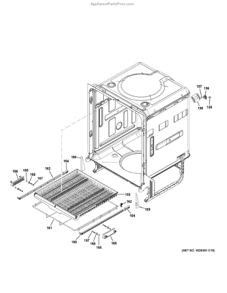 Secures dishwasher racks and restores stable mounting. Replace this rail and end cap assembly if worn, damaged, cracked, or causing racks to sag or detach.