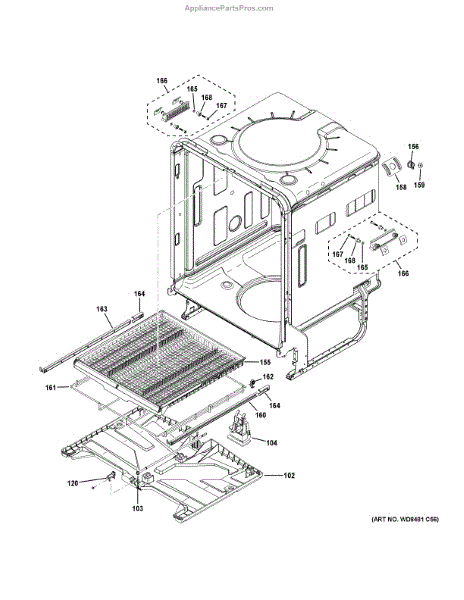 Coated wire frame assembly that supports and retains internal dishwasher components. Replace if damaged, corroded, bent, or broken for proper structure.