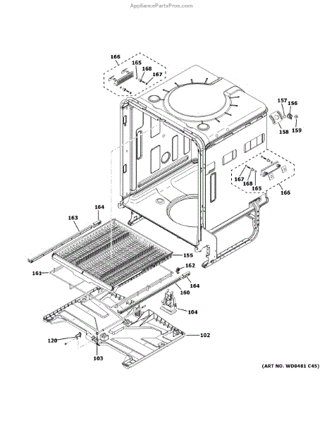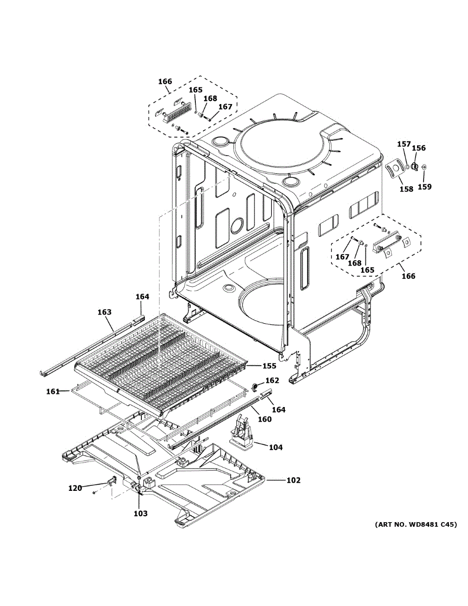 Coated wire frame assembly that supports and retains internal dishwasher components. Replace if damaged, corroded, bent, or broken for proper structure.