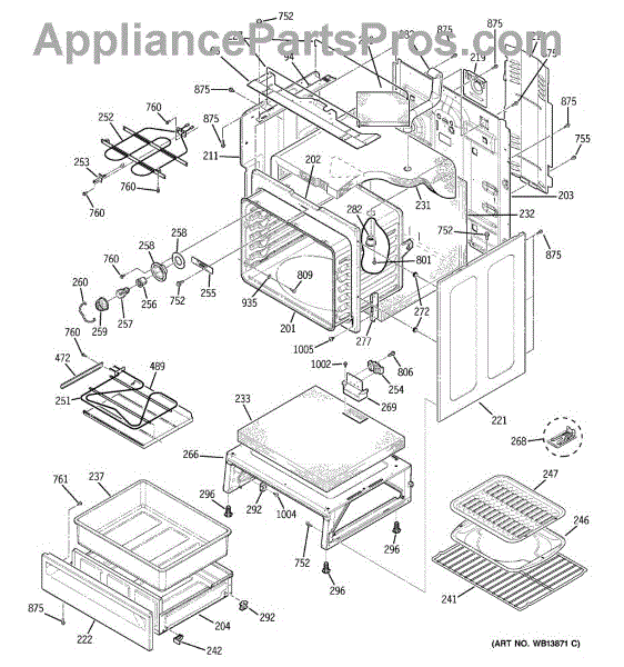 The Rear Door Support is an OEM replacement part for GE ranges. Located at the base of the range, this bracket provides weight-bearing support for the lower oven drawer. It facilitates smooth extension and retraction of the drawer. Causes of faulty support can include cracks or fractures developing over extended use, worn joints unable to sustain drawer weight, or misalignment from repeated opening/closing stress. Symptoms of a bad support include: