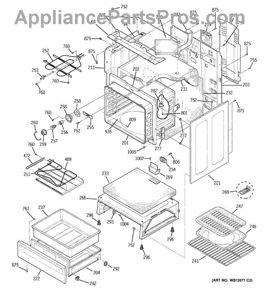 The Rear Door Support is an OEM replacement part for GE ranges. Located at the base of the range, this bracket provides weight-bearing support for the lower oven drawer. It facilitates smooth extension and retraction of the drawer. Causes of faulty support can include cracks or fractures developing over extended use, worn joints unable to sustain drawer weight, or misalignment from repeated opening/closing stress. Symptoms of a bad support include: