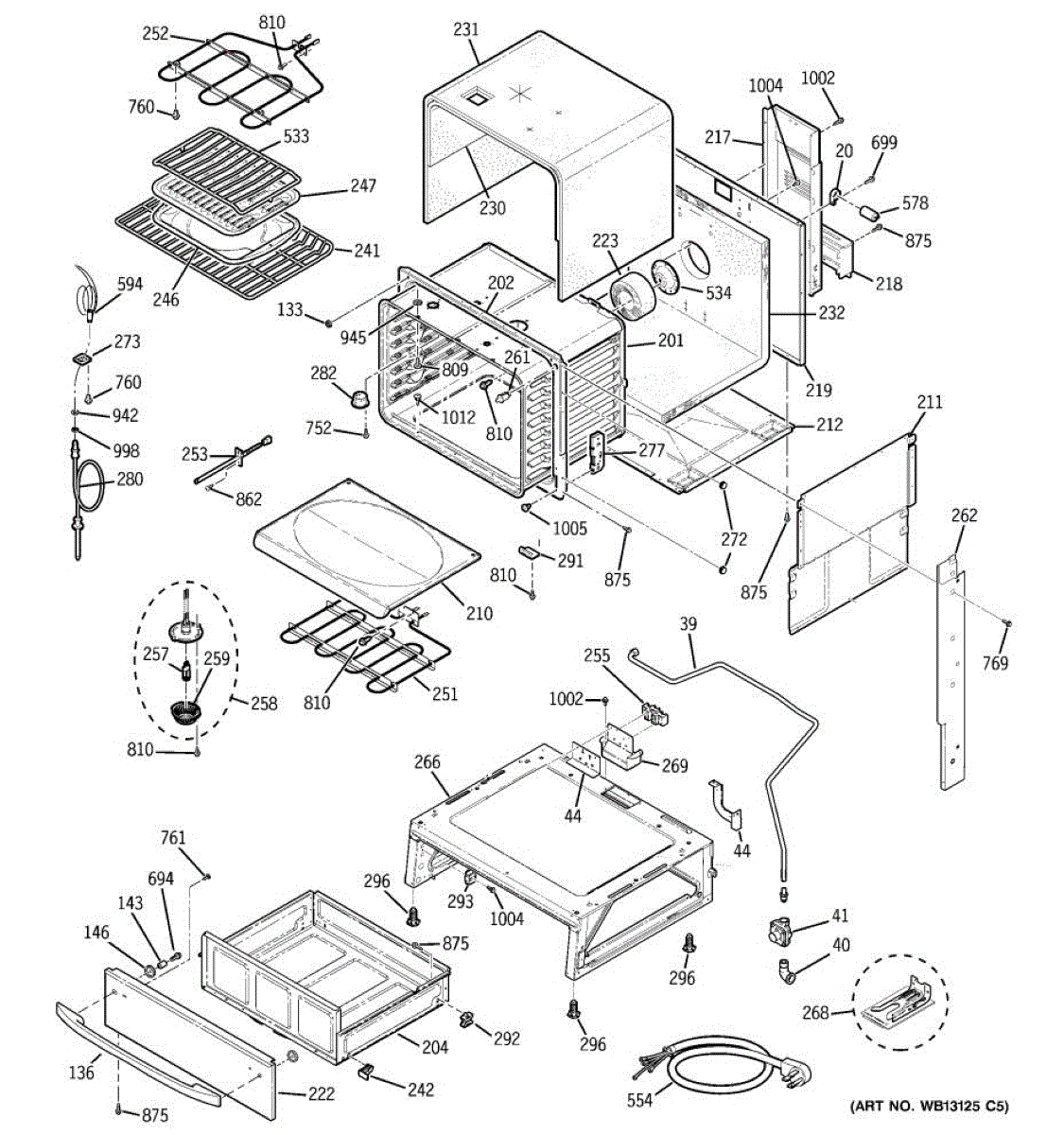 Oven cavity wrapper assembly forms the outer shell around the cooking chamber. Replace if cracked, damaged, or rusted to restore structural integrity.