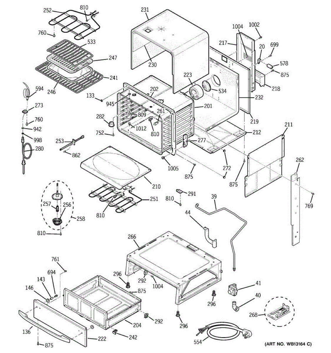 Oven cavity wrapper assembly forms the outer shell around the cooking chamber. Replace if cracked, damaged, or rusted to restore structural integrity.