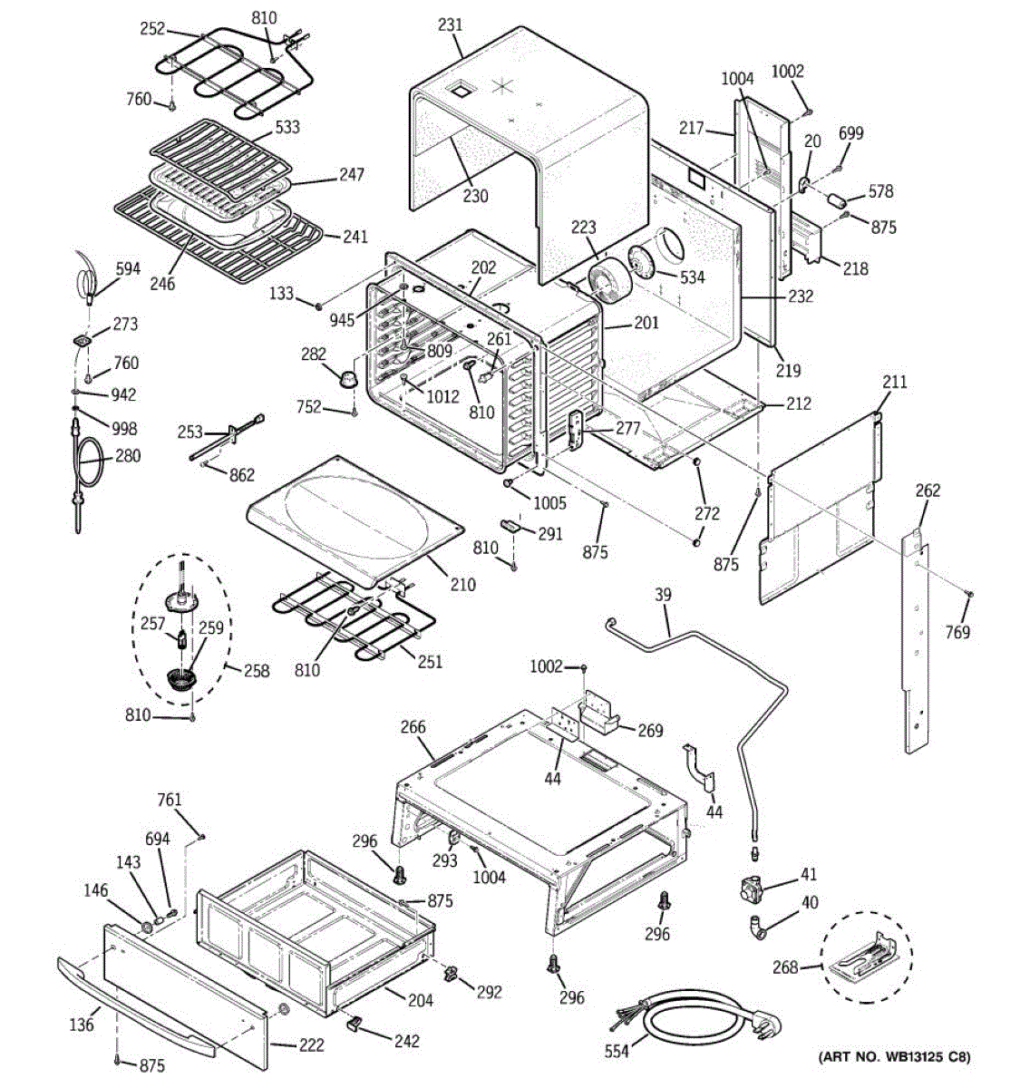 Oven cavity wrapper assembly forms the outer shell around the cooking chamber. Replace if cracked, damaged, or rusted to restore structural integrity.