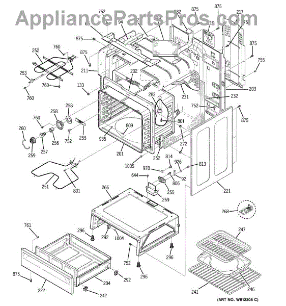 The Rear Door Support is an OEM replacement part for GE ranges. Located at the base of the range, this bracket provides weight-bearing support for the lower oven drawer. It facilitates smooth extension and retraction of the drawer. Causes of faulty support can include cracks or fractures developing over extended use, worn joints unable to sustain drawer weight, or misalignment from repeated opening/closing stress. Symptoms of a bad support include: