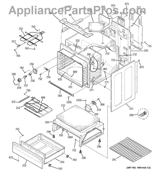 The Rear Door Support is an OEM replacement part for GE ranges. Located at the base of the range, this bracket provides weight-bearing support for the lower oven drawer. It facilitates smooth extension and retraction of the drawer. Causes of faulty support can include cracks or fractures developing over extended use, worn joints unable to sustain drawer weight, or misalignment from repeated opening/closing stress. Symptoms of a bad support include: