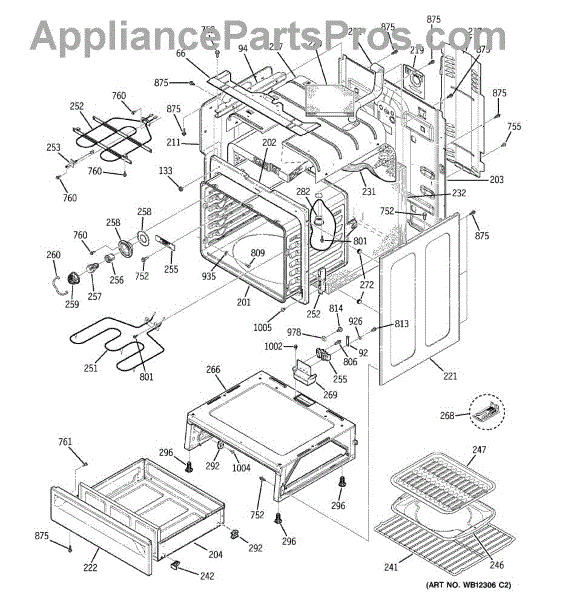 The Rear Door Support is an OEM replacement part for GE ranges. Located at the base of the range, this bracket provides weight-bearing support for the lower oven drawer. It facilitates smooth extension and retraction of the drawer. Causes of faulty support can include cracks or fractures developing over extended use, worn joints unable to sustain drawer weight, or misalignment from repeated opening/closing stress. Symptoms of a bad support include: