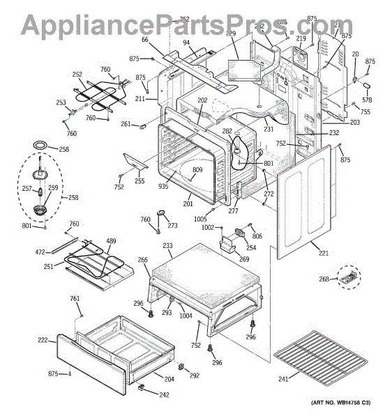 The Rear Door Support is an OEM replacement part for GE ranges. Located at the base of the range, this bracket provides weight-bearing support for the lower oven drawer. It facilitates smooth extension and retraction of the drawer. Causes of faulty support can include cracks or fractures developing over extended use, worn joints unable to sustain drawer weight, or misalignment from repeated opening/closing stress. Symptoms of a bad support include: