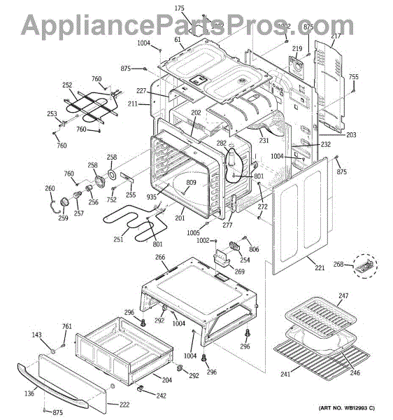 The Rear Door Support is an OEM replacement part for GE ranges. Located at the base of the range, this bracket provides weight-bearing support for the lower oven drawer. It facilitates smooth extension and retraction of the drawer. Causes of faulty support can include cracks or fractures developing over extended use, worn joints unable to sustain drawer weight, or misalignment from repeated opening/closing stress. Symptoms of a bad support include:
