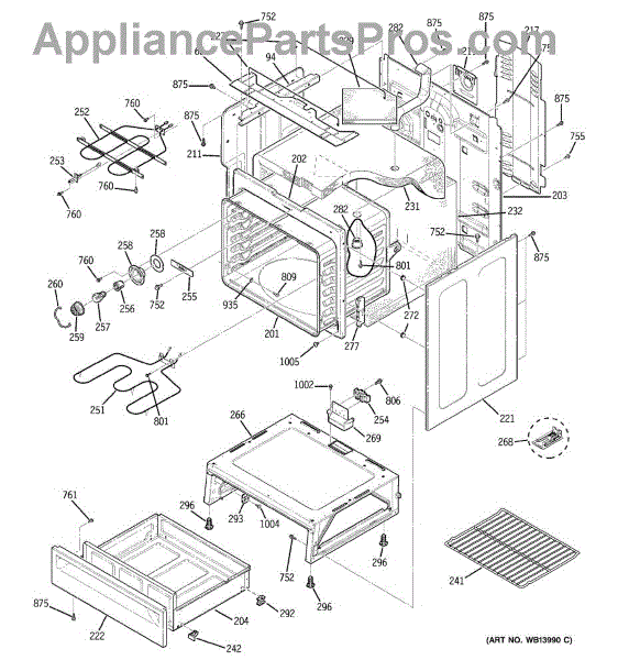 The Rear Door Support is an OEM replacement part for GE ranges. Located at the base of the range, this bracket provides weight-bearing support for the lower oven drawer. It facilitates smooth extension and retraction of the drawer. Causes of faulty support can include cracks or fractures developing over extended use, worn joints unable to sustain drawer weight, or misalignment from repeated opening/closing stress. Symptoms of a bad support include: