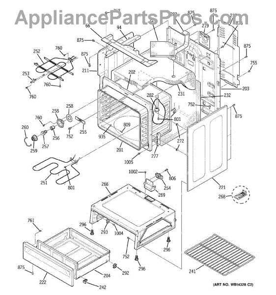 The Rear Door Support is an OEM replacement part for GE ranges. Located at the base of the range, this bracket provides weight-bearing support for the lower oven drawer. It facilitates smooth extension and retraction of the drawer. Causes of faulty support can include cracks or fractures developing over extended use, worn joints unable to sustain drawer weight, or misalignment from repeated opening/closing stress. Symptoms of a bad support include: