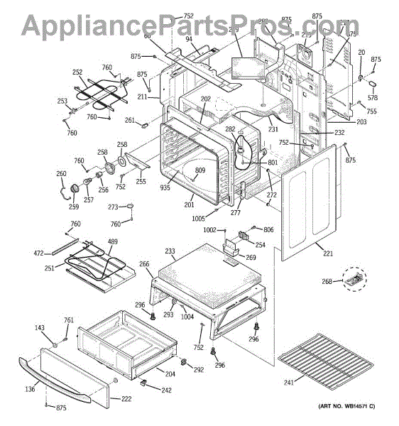 The Rear Door Support is an OEM replacement part for GE ranges. Located at the base of the range, this bracket provides weight-bearing support for the lower oven drawer. It facilitates smooth extension and retraction of the drawer. Causes of faulty support can include cracks or fractures developing over extended use, worn joints unable to sustain drawer weight, or misalignment from repeated opening/closing stress. Symptoms of a bad support include: