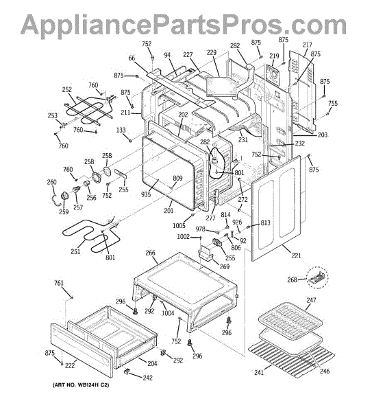 The Rear Door Support is an OEM replacement part for GE ranges. Located at the base of the range, this bracket provides weight-bearing support for the lower oven drawer. It facilitates smooth extension and retraction of the drawer. Causes of faulty support can include cracks or fractures developing over extended use, worn joints unable to sustain drawer weight, or misalignment from repeated opening/closing stress. Symptoms of a bad support include: