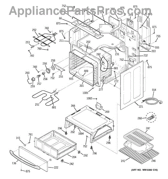 The Rear Door Support is an OEM replacement part for GE ranges. Located at the base of the range, this bracket provides weight-bearing support for the lower oven drawer. It facilitates smooth extension and retraction of the drawer. Causes of faulty support can include cracks or fractures developing over extended use, worn joints unable to sustain drawer weight, or misalignment from repeated opening/closing stress. Symptoms of a bad support include: