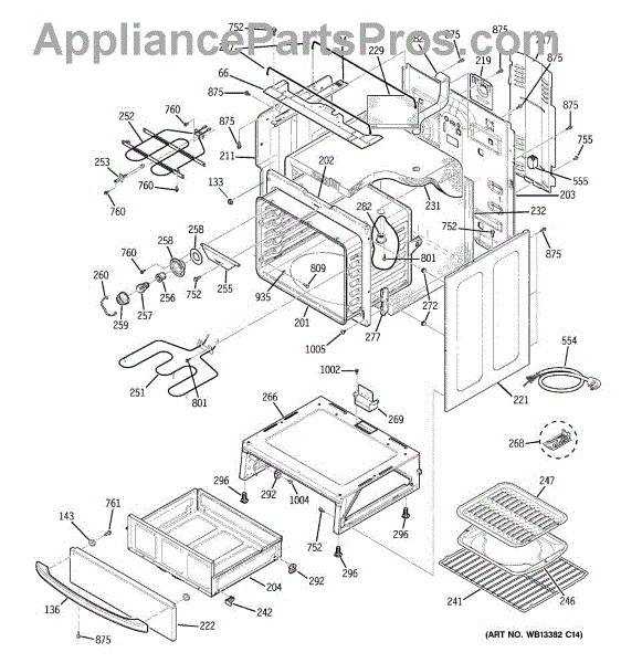 The Rear Door Support is an OEM replacement part for GE ranges. Located at the base of the range, this bracket provides weight-bearing support for the lower oven drawer. It facilitates smooth extension and retraction of the drawer. Causes of faulty support can include cracks or fractures developing over extended use, worn joints unable to sustain drawer weight, or misalignment from repeated opening/closing stress. Symptoms of a bad support include: