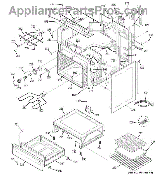 The Rear Door Support is an OEM replacement part for GE ranges. Located at the base of the range, this bracket provides weight-bearing support for the lower oven drawer. It facilitates smooth extension and retraction of the drawer. Causes of faulty support can include cracks or fractures developing over extended use, worn joints unable to sustain drawer weight, or misalignment from repeated opening/closing stress. Symptoms of a bad support include: