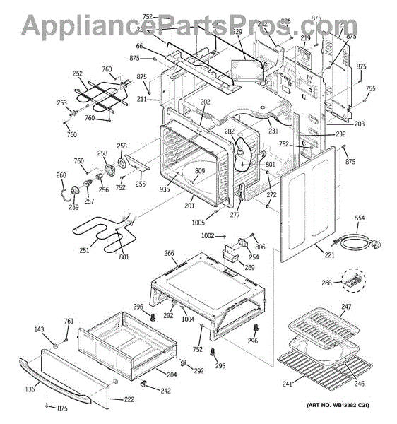 The Rear Door Support is an OEM replacement part for GE ranges. Located at the base of the range, this bracket provides weight-bearing support for the lower oven drawer. It facilitates smooth extension and retraction of the drawer. Causes of faulty support can include cracks or fractures developing over extended use, worn joints unable to sustain drawer weight, or misalignment from repeated opening/closing stress. Symptoms of a bad support include: