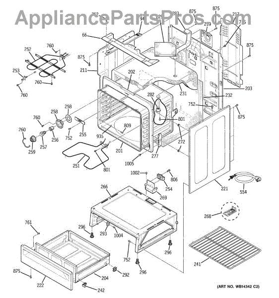 The Rear Door Support is an OEM replacement part for GE ranges. Located at the base of the range, this bracket provides weight-bearing support for the lower oven drawer. It facilitates smooth extension and retraction of the drawer. Causes of faulty support can include cracks or fractures developing over extended use, worn joints unable to sustain drawer weight, or misalignment from repeated opening/closing stress. Symptoms of a bad support include: