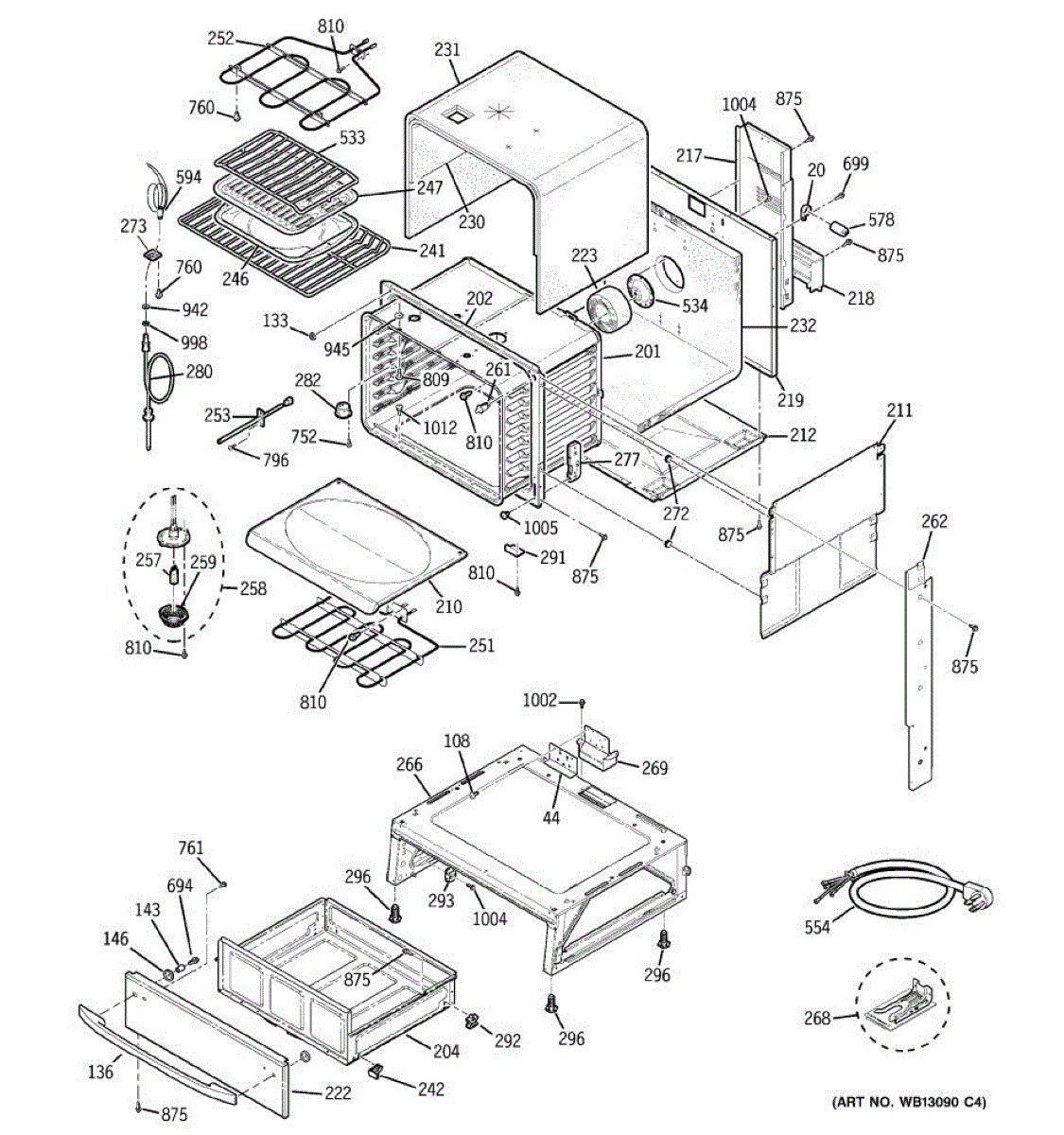 Oven cavity wrapper assembly forms the outer shell around the cooking chamber. Replace if cracked, damaged, or rusted to restore structural integrity.