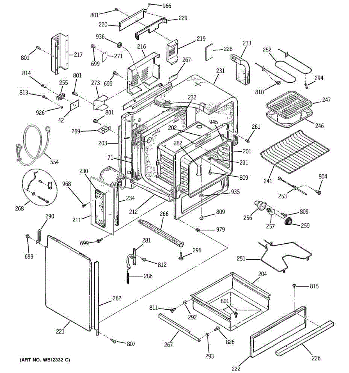 Left side oven door hinge provides smooth opening and closing operation. Replace if cracked, seized, worn, or binding. Mounts to oven cavity interior.