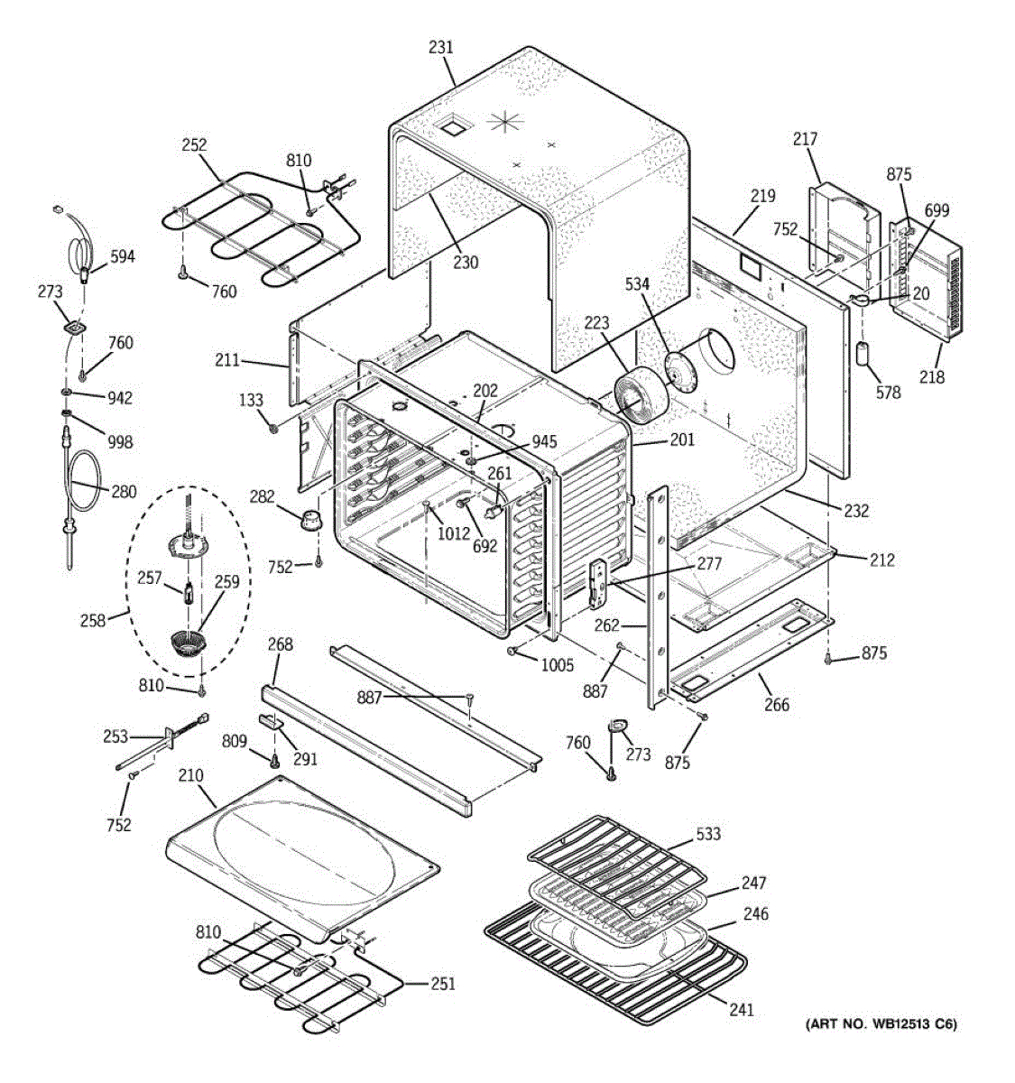 Oven cavity wrapper assembly forms the outer shell around the cooking chamber. Replace if cracked, damaged, or rusted to restore structural integrity.