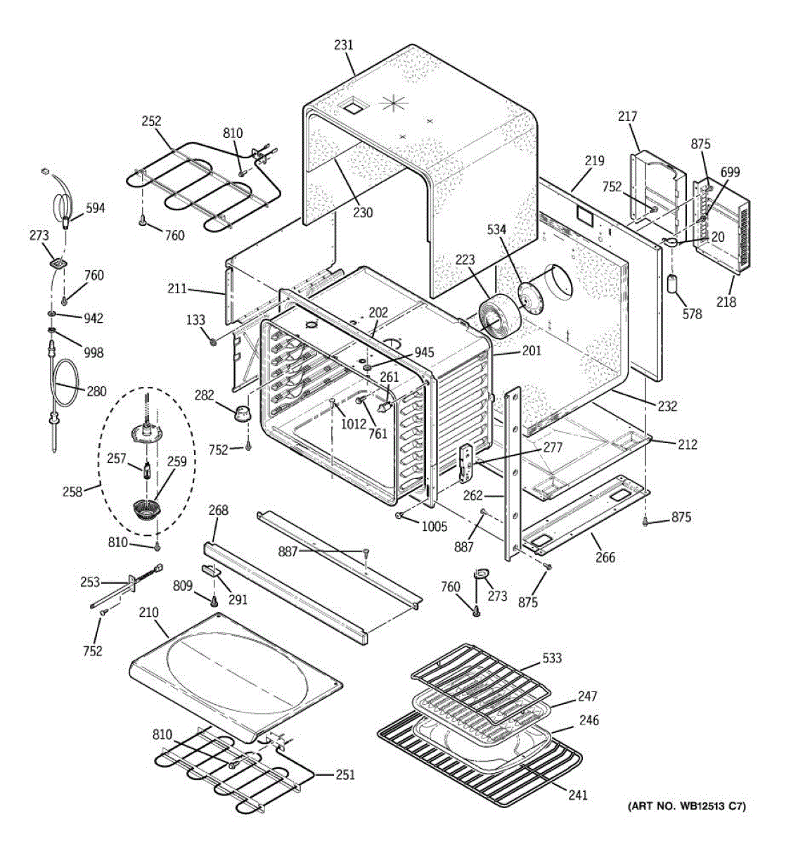 Oven cavity wrapper assembly forms the outer shell around the cooking chamber. Replace if cracked, damaged, or rusted to restore structural integrity.