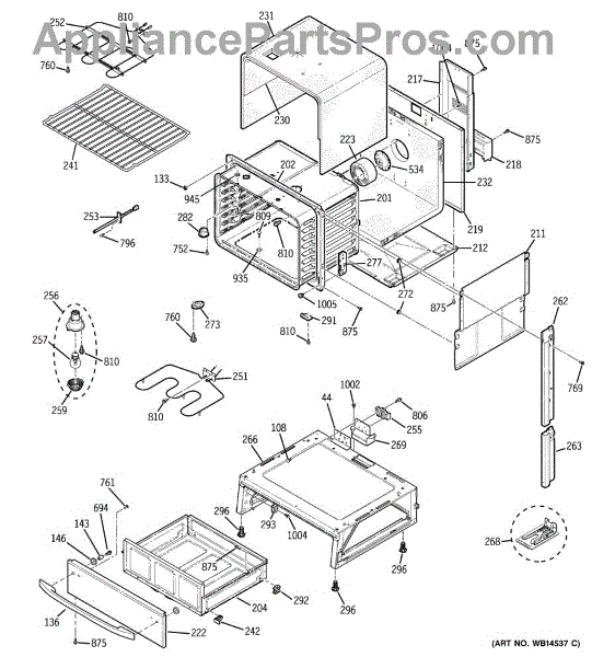 The Rear Door Support is an OEM replacement part for GE ranges. Located at the base of the range, this bracket provides weight-bearing support for the lower oven drawer. It facilitates smooth extension and retraction of the drawer. Causes of faulty support can include cracks or fractures developing over extended use, worn joints unable to sustain drawer weight, or misalignment from repeated opening/closing stress. Symptoms of a bad support include: