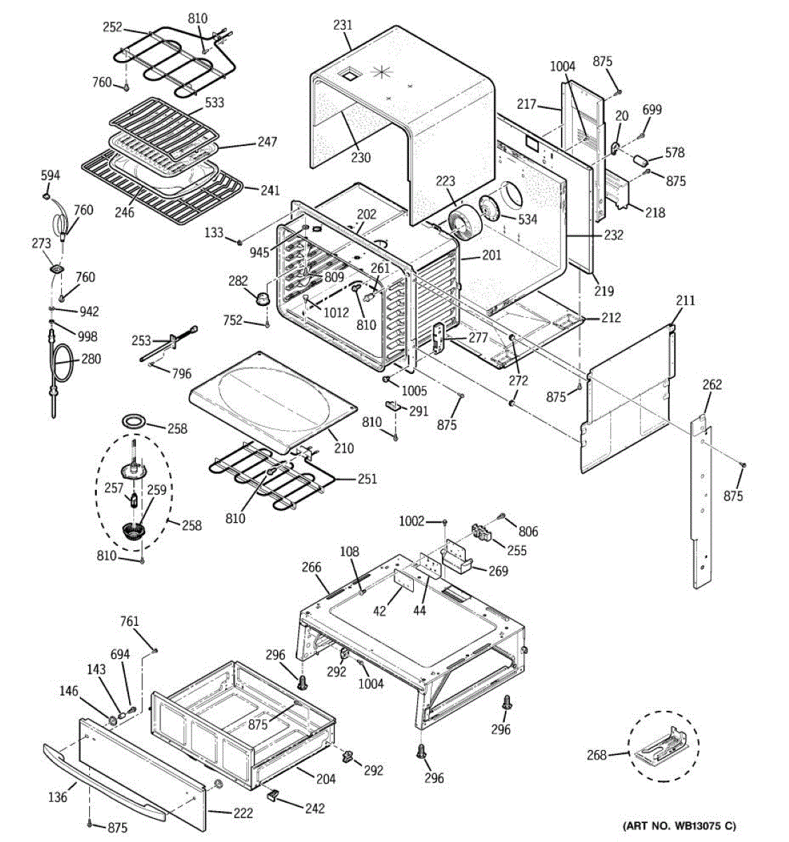 Oven cavity wrapper assembly forms the outer shell around the cooking chamber. Replace if cracked, damaged, or rusted to restore structural integrity.
