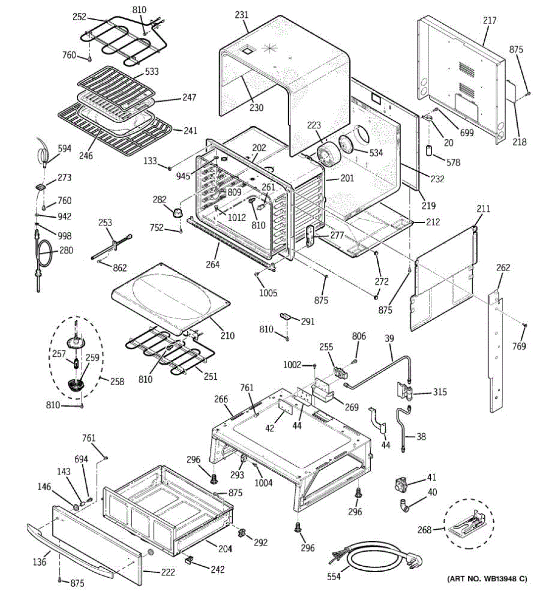Oven cavity wrapper assembly forms the outer shell around the cooking chamber. Replace if cracked, damaged, or rusted to restore structural integrity.