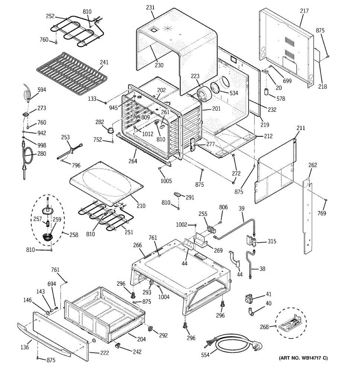 Oven cavity wrapper assembly forms the outer shell around the cooking chamber. Replace if cracked, damaged, or rusted to restore structural integrity.