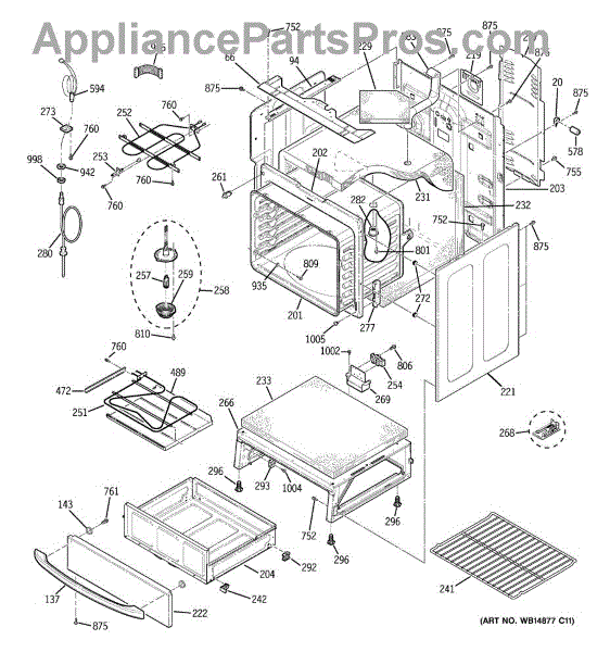 The Rear Door Support is an OEM replacement part for GE ranges. Located at the base of the range, this bracket provides weight-bearing support for the lower oven drawer. It facilitates smooth extension and retraction of the drawer. Causes of faulty support can include cracks or fractures developing over extended use, worn joints unable to sustain drawer weight, or misalignment from repeated opening/closing stress. Symptoms of a bad support include: